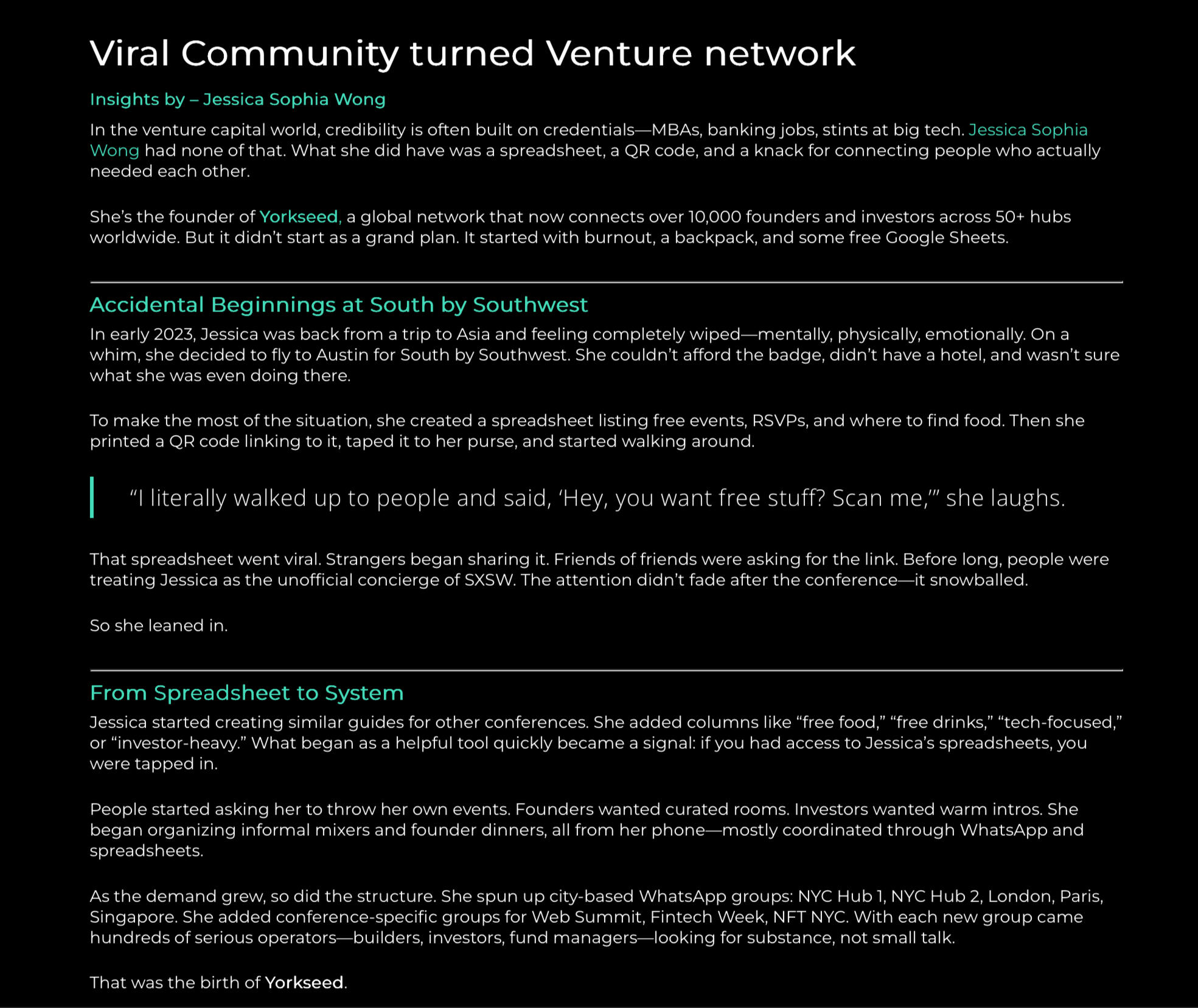 Yorkseed™ is an exclusive global venture network founded by Jessica Sophia Wong, connecting founders and investors worldwide. We bridge entrepreneurs with capital, link founders to diverse markets, and establish global hubs to expand investor reach. What began as a simple joke (spreadsheet) that went viral at SXSW 2023 quickly evolved into a global community. In less than a year since we started, Yorkseed outgrew our first WhatsApp’s capacity in SXSW Austin, and today counts 10,000+ members across 50 city and conference hubs. In New York alone, we outgrew WhatsApp’s capacity and our group includes over 1,000 vetted founders and investors, while our newsletter reaches Angels, VCs, Family Offices, GPs, LPs, and founders from early-stage to IPO.Since April 2023, we’ve hosted exclusive events in five countries, always maintaining a strict application process to ensure the highest caliber of participants. Yet, Yorkseed is not an event company - our gatherings are designed to plant the seeds of long-term value, trust, and opportunity.Looking ahead, Yorkseed’s vision extends into venture. We are building toward the launch of Yorkseed Venture to back high-growth startups and laying the foundation for a flagship Yorkseed Conference. As we grow, we continue to seek strategic collaborations, partnerships, and sponsorships to amplify our global impact.